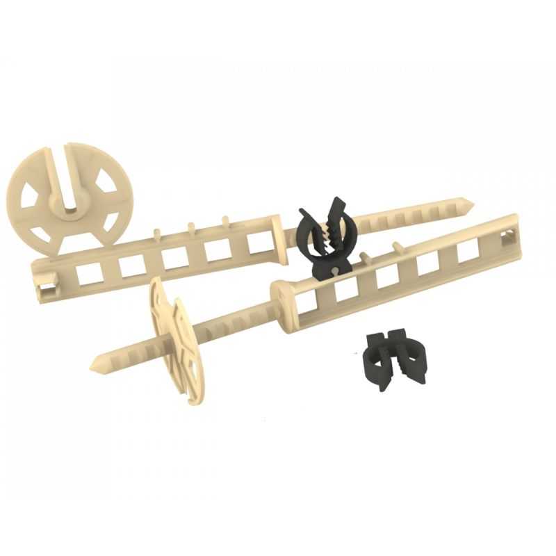 Два элемента стяжки имеют стержни с рифлением для установки крепежных замков и установки стенок опалубки толщиной от 10 до 100 мм, а соединение элементов между собой осуществляется при помощи специального крепления по принципу «шип-паз». По краям стяжек имеются закладные под арматуру, с помощью которых возможна регулировка толщины защитного слоя бетона (30, 50 или 70 мм). Удлинители не входят в комплект и используются при необходимости увеличить ширину опалубки.